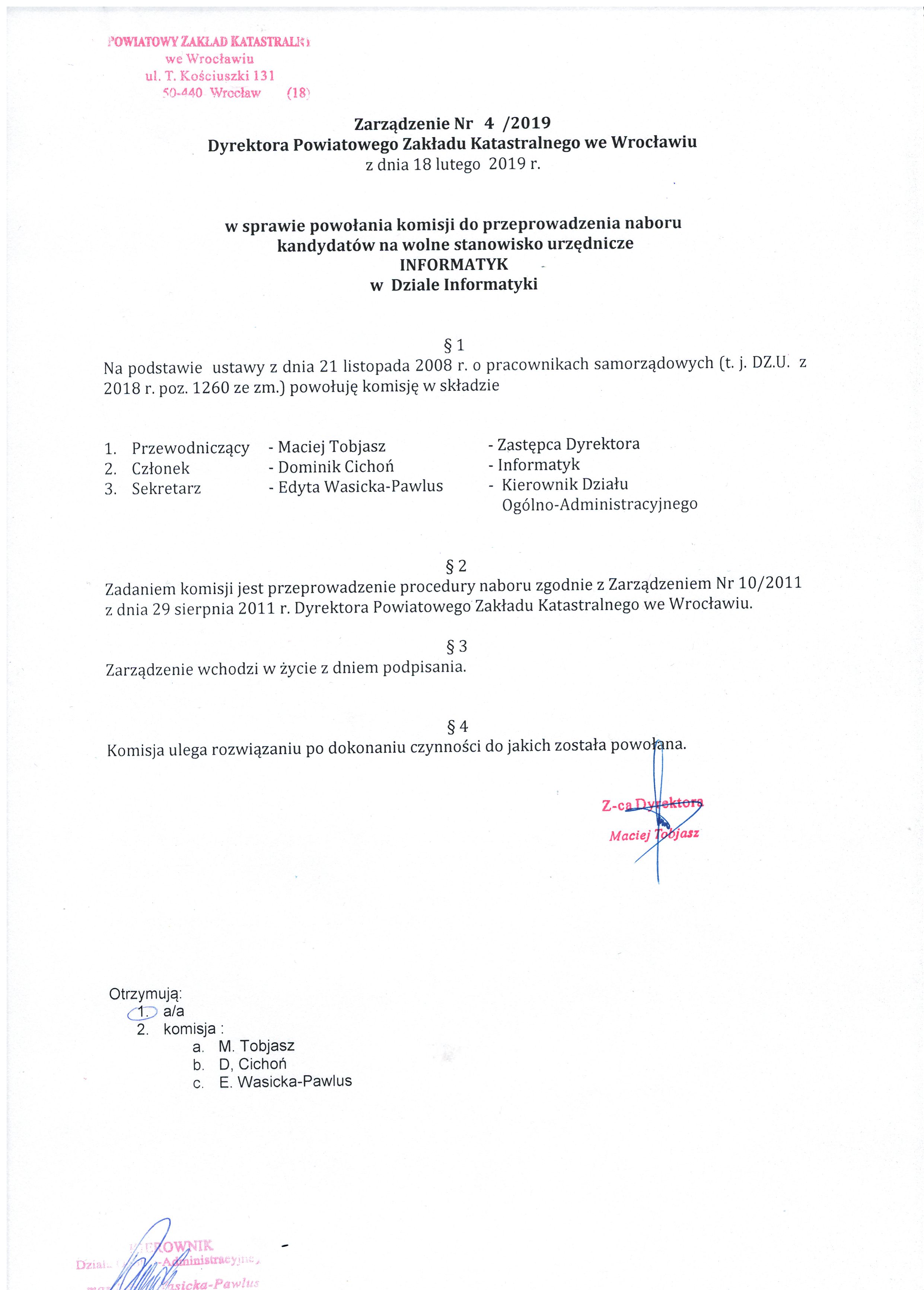 Zarządzenie Nr 4/2019 Dyrektora Powiatowego Zakładu Katastralnego we Wrocławiu z dnia 18 lutego 2019 r. w sprawie powołania komisji do przeprowadzenia naboru kandydatów na wolne stanowisko urzędnicze INFORMATYK w Dziale Informatyki